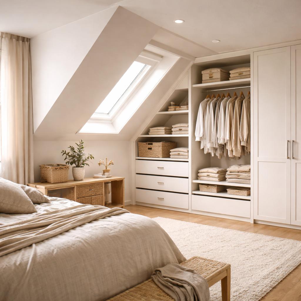 Спальня ниша, узкий проход, скошенный потолок, неудобный простенок встроенное хранение по размеру стены, использование высоты, спокойные фасады