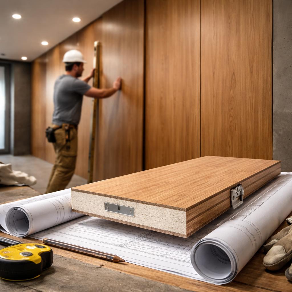 Шпонированная панель на гипсовой или композитной основе легче и технологичнее в установке. В коммерческом строительстве это сокращает сроки работ и снижает трудозатраты.