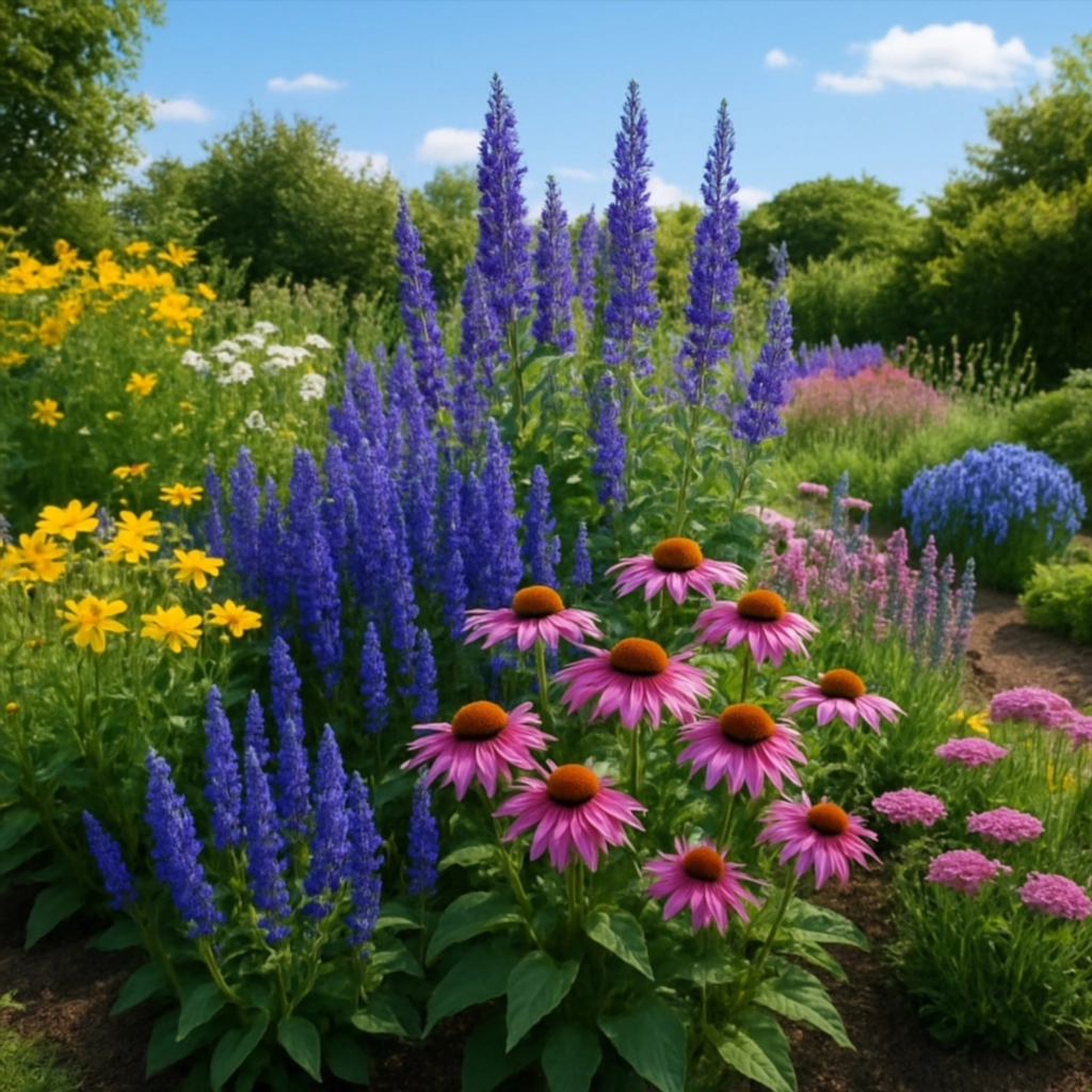 - Используйте контрасты цвета — например, жёлтые гайлардии рядом с фиолетовыми шалфеями.