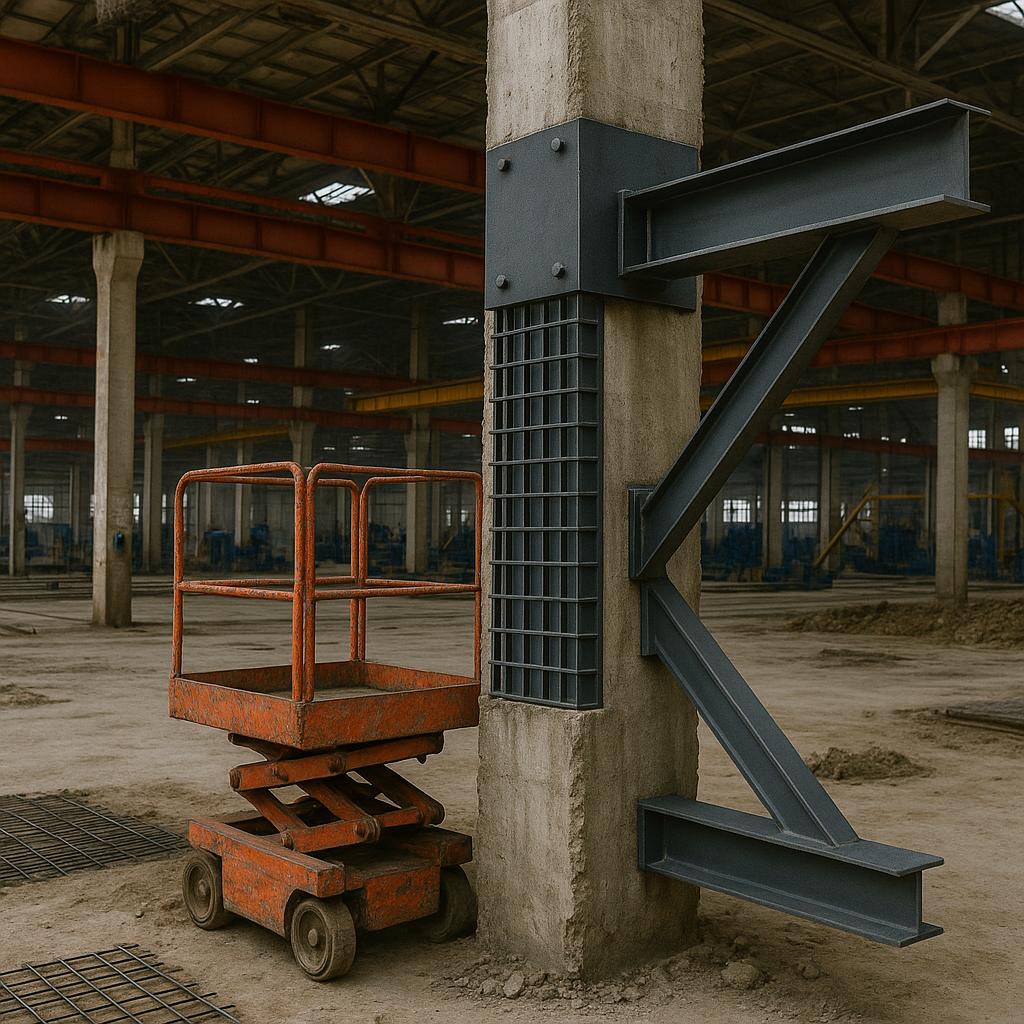 При монтаже кран-балок или переходе на тяжелые подвесные системы нагрузка на колонны возрастает кратно. Инженеры применяют: