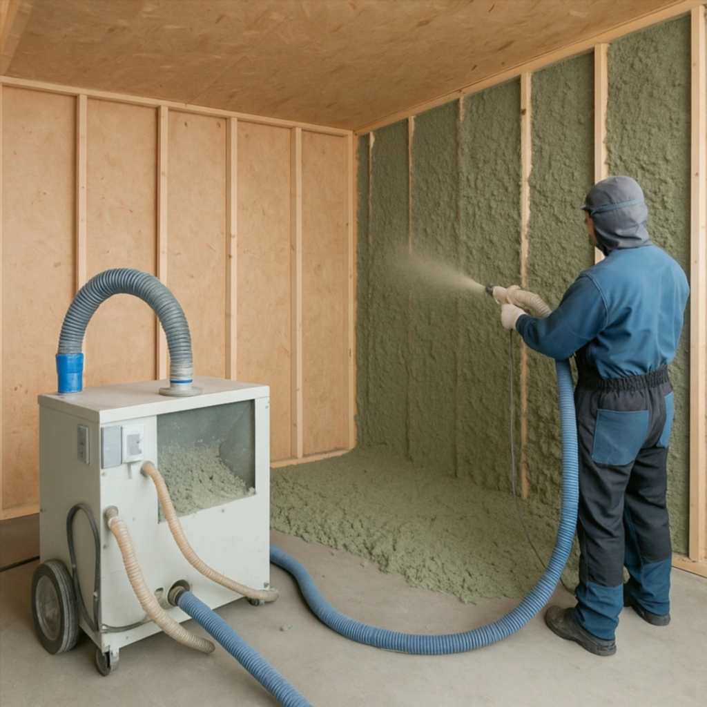 Суть метода заключается в том, что эковата перед нанесением смачивается водой (или специальным клеевым раствором), а затем с помощью оборудования наносится на вертикальную поверхность, где она прочно сцепляется с основанием и создает монолитный теплоизоляционный слой. После высыхания материал сохраняет высокую плотность, не дает усадки и обеспечивает отличную звуко- и теплоизоляцию.