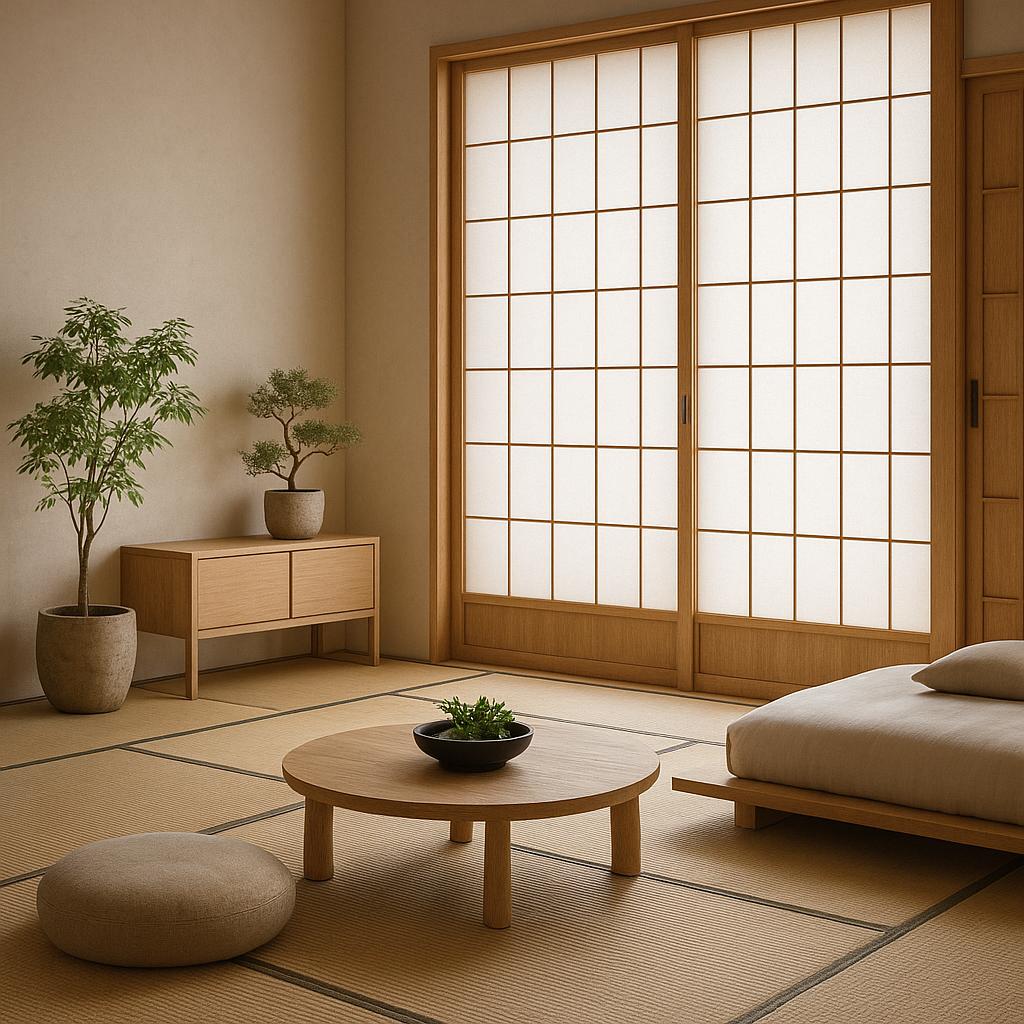 Природные материалы занимают центральное место: дерево, камень, бамбук, рисовая бумага. Они создают ощущение тепла и естественности, позволяя интерьеру дышать. Даже в городских квартирах можно использовать низкие деревянные столики, циновки или перегородки-сёдзи, которые напоминают о традиционных японских домах.